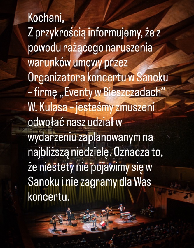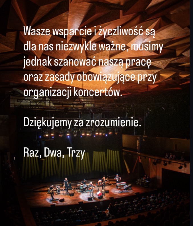 Informacji na temat zwrotu pieniędzy za zakupione bilety na odwołany koncert zespołu „Raz Dwa Trzy” udziela organizator wydarzenia firma „Eventy w Bieszczadach” Wojciech Kulasa tel. 515 608 439, mail: wojtekkulasa@gmail.com