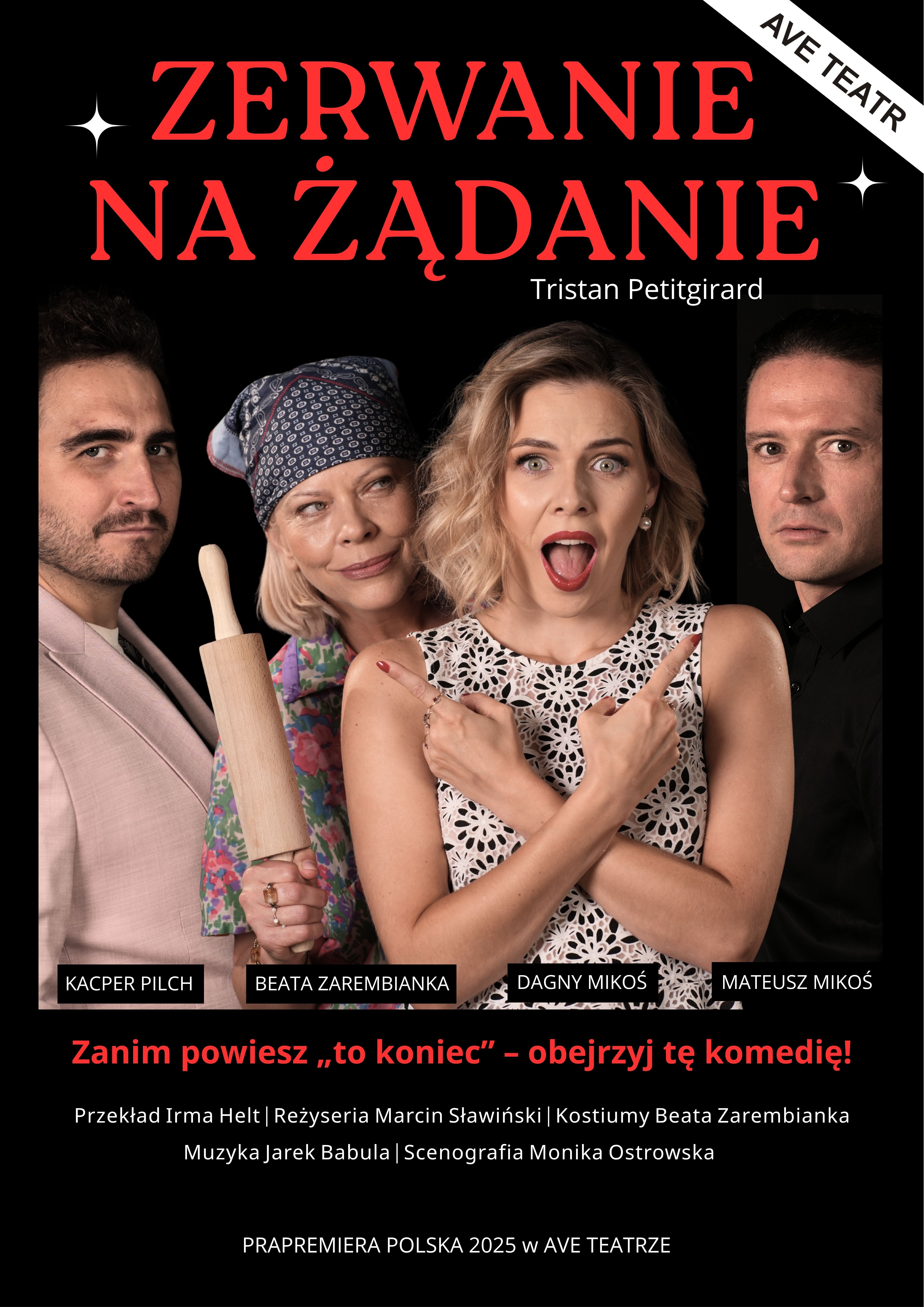 Czy da się zerwać z klasą? A może... zlecić to komuś innemu? Eric ma nietypową pracę - zawodowo zrywa w imieniu innych. Dla jednych to szczyt cynizmu, dla innych - upragniona ulga i... oszczędność czasu. Pewnego wieczoru trafia do mieszkania Anny, aby zrealizować kolejne zlecenie. Ale nic nie pójdzie zgodnie z planem. Anna okazuje się kimś więcej, niż tylko kolejną klientką, a sytuacja komplikuje się jeszcze bardziej, gdy na scenie pojawia się Edward - zazdrosny partner z wybujałą wyobraźnią i alergią na prawdę. Zawrotne tempo, błyskotliwe dialogi, nieporozumienia, kłamstewka i ujawnione sekrety - to wszystko składa się na zwariowaną komedię o tym, że uczucia trudno zaplanować, a przeszłość ma dziwny zwyczaj powracania... w najmniej spodziewanym momencie. "Zerwanie na żądanie" to inteligentna, francuska komedia pomyłek, w której śmiech łączy się z refleksją nad współczesnymi relacjami. Spektakl, który bawi, ale też zaskakuje trafnością obserwacji, miłosnych dramatów i ich codziennej (nie)logiki.